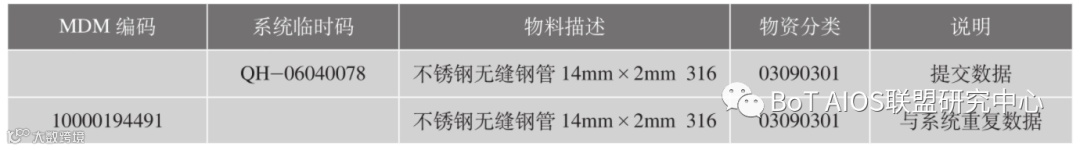 数据的唯一性检查是指根据唯一性规则对数据进行精确和模糊匹配检查。符合精确匹配规则的数据为重复数据,模糊匹配出来的结果则需要辅以人工检查。例如,提交的物料描述为“不锈钢无缝钢管14mm×2mm 316”与系统里编码为10000194491的数据精确匹配,则为重复数据
