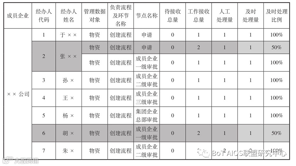 主数据审批流程中,有多个管理角色。以物资主数据审批流程为例,包括物资需求申请人员、物资管理审核岗、上级物资采购管理单位、主数据配码审核运维人员和数据发布岗位等。在效率评价实际情况中,可采用统一的指标对上述经办人进行审批及时性评价。对评价及时性差的流程,可督促经办人提高工作效率。下表中代码为“002”和“006”的经办人,及时处理比例为50%属于及时性差,他们应该提高工作效率。