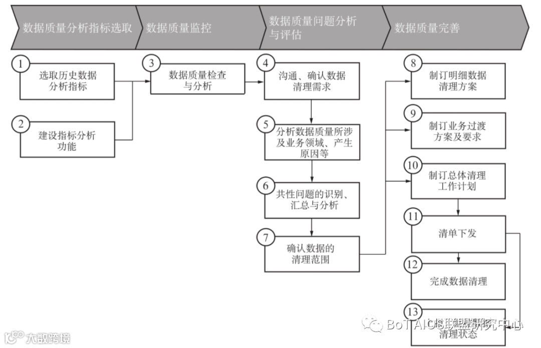 主数据清理分为数据质量分析指标选取、数据质量监控、数据质量问题分析与评估以及数据质量完善四个阶段: