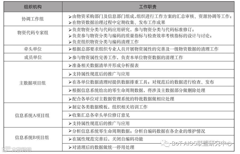 为保证主数据清理工作顺利开展,应明确参与协调、支持、实施各团队的职责。以某公司的物资主数据清理组织为例: