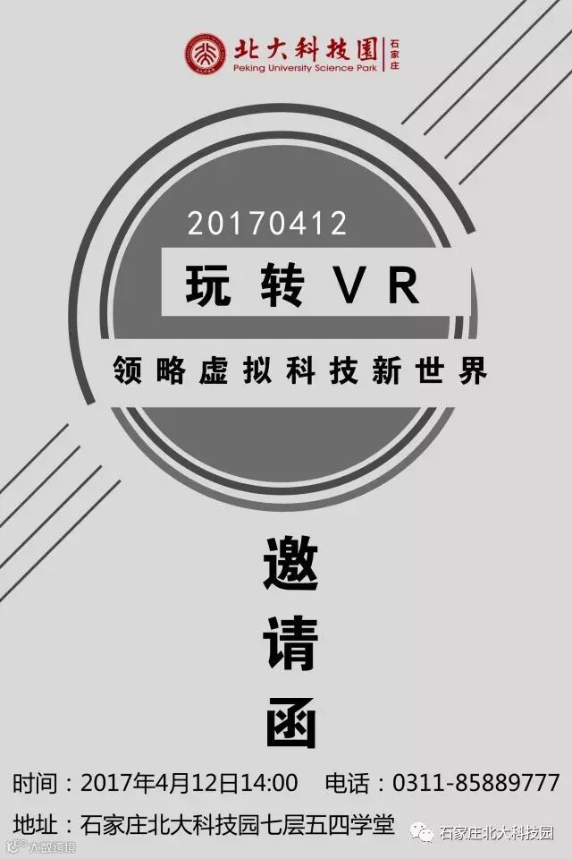 您好!我们很荣幸地邀请您于4月12日参加石家庄北大科技园举办的“玩转VR,领略虚拟科技新世界”主题活动。