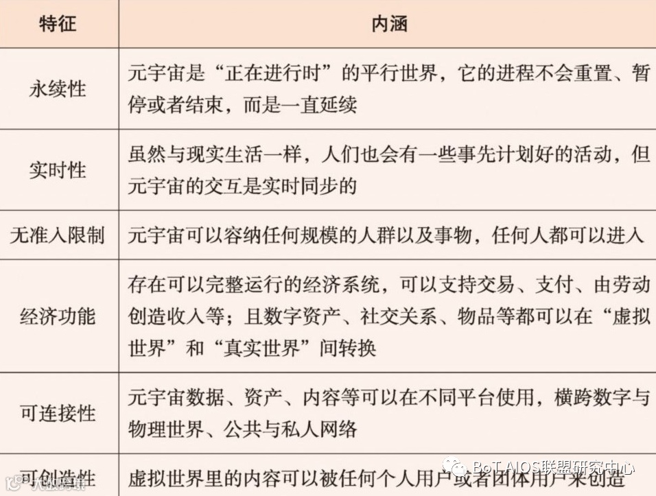 Metaverse的关键特征包括永续性、实时性、无准入限制、经济功能、可连接性、可创造性