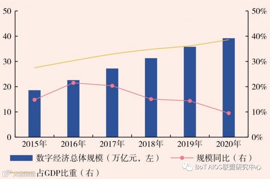 据中国信息通信研究院(以下简称“中国信通院”)的数据显示,2020年我国数字经济规模达到39.2万亿元,同比增长9.5%,大幅高于GDP的增速2.3%;从比重看,2020年数字经济占GDP的比重已经达到38.6%,较2019年的占比提升了2.4个百分点。