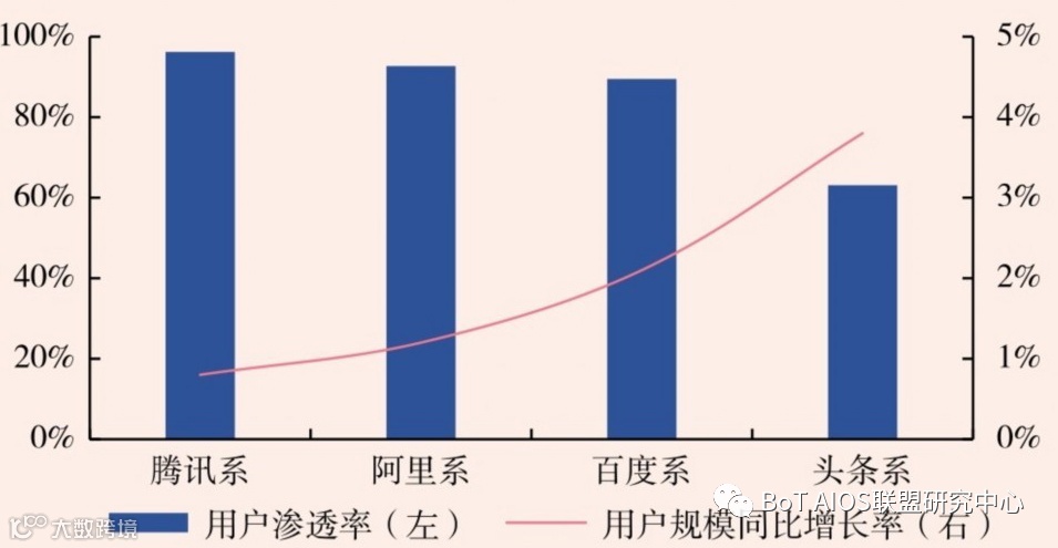 截至2021Q2,BAT(B指百度、A指阿里巴巴、T指腾讯)渗透率均超80%,其中腾讯系和阿里系的用户渗透率分别达到96.2%和92.7%。