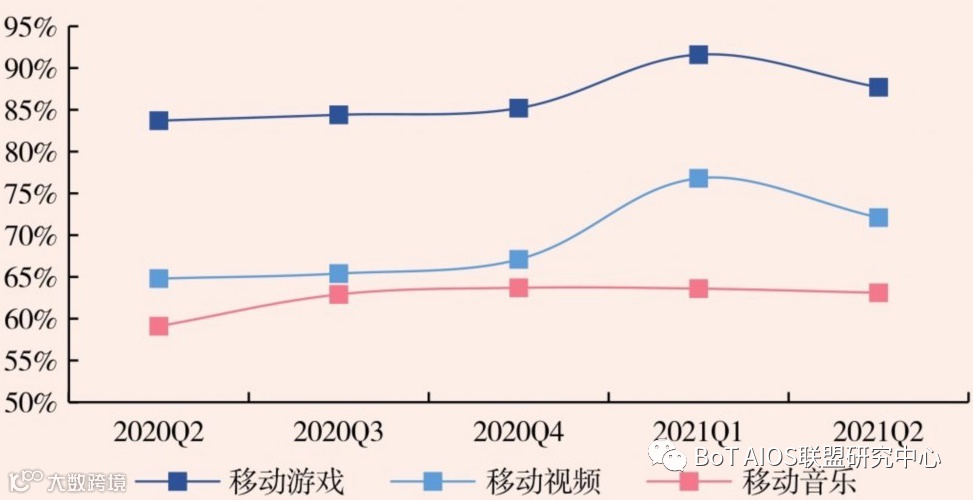 2021Q2,我国移动游戏、移动视频和移动音乐的用户渗透率分别达到87.7%、72.1%和63.1%,几大应用场景面临未来增长的瓶颈