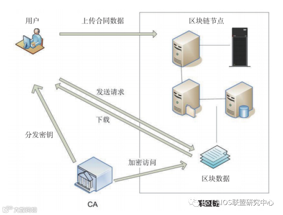 第三方CA负责用户的身份认证及密钥发放,审计员通过加密通道访问区块数据,通过数字指纹查验合同文件的真伪,提供合同公证服务。