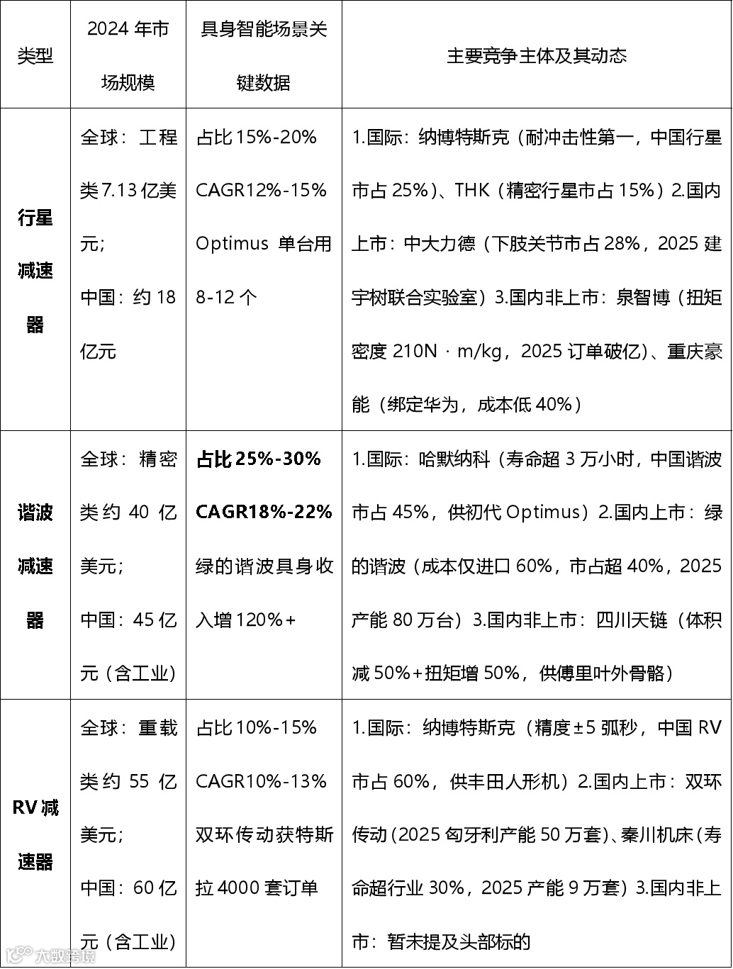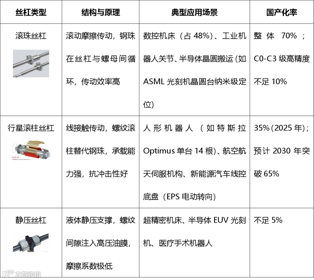 建议关注方向:行星滚柱丝杠的核心难题是“量产与成本”——过去依赖航空航天等价格不敏感领域,人形机器人将推动其规模化;建议关注两类企业:①航空航天/军工出身的企业(技术积累深厚);②微型行星滚柱丝杠企业(用于灵巧手,技术难度高,需求小众但壁垒高)。