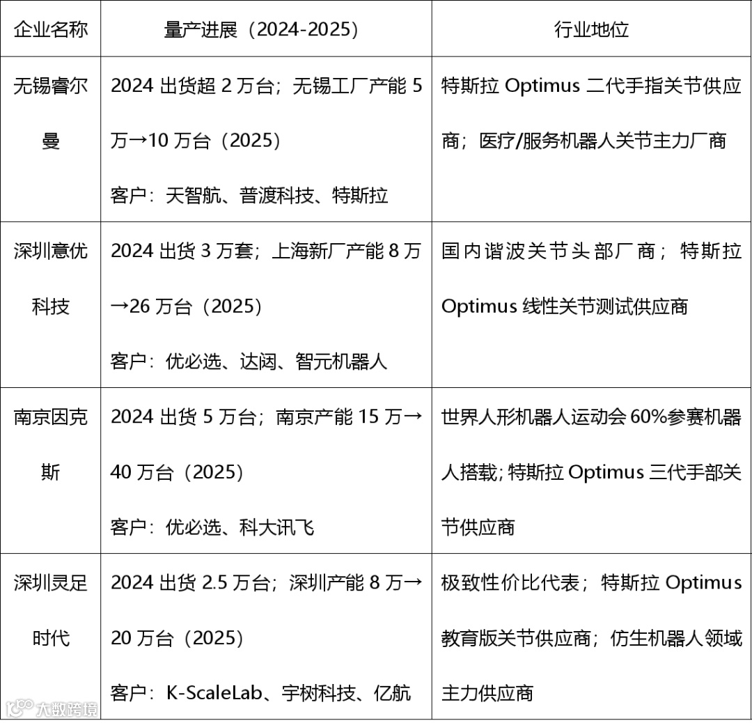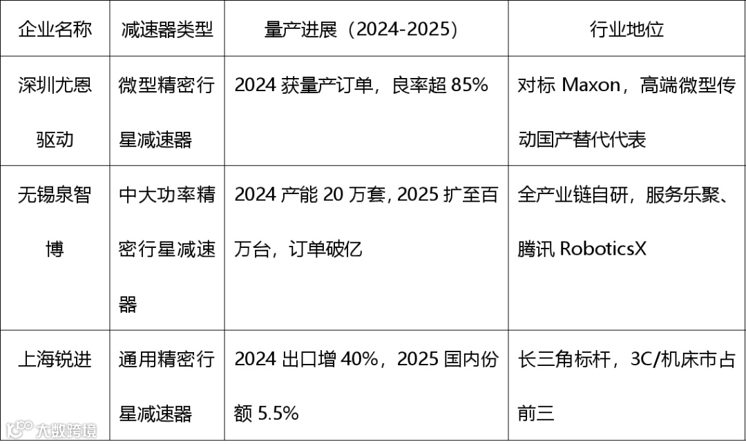 代表性企业:深圳诺仕。公司可生产全球最小微型丝杠(丝杠1.5mm、螺母5.5mm),负载10kg、寿命超300万次,C5级精度量产,成本仅进口1/3;重载执行器推力8000N,适配机器人关节。依托专利实现高精度、高承载,成本与效率优势显著。量产方面,上海基地月产超10万套,获头部人形机器人、锂电厂商订单,2025年苏州二期投产后年产能200万套;产品进入特斯拉Optimus、优必选供应链,与上汽合作开发汽车EMB系统,多行业批量应用。