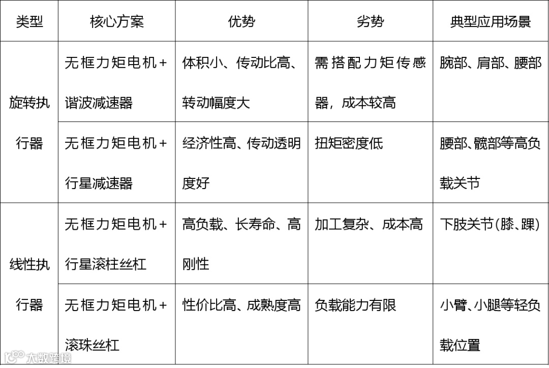 从各家人形机器人厂商的执行器方案来看,大部分厂商以旋转执行器为主。而二者动力来源基本都为无框力矩电机,不同之处在于传动结构,线性执行器依赖丝杠,而旋转执行器则借助精密减速器。