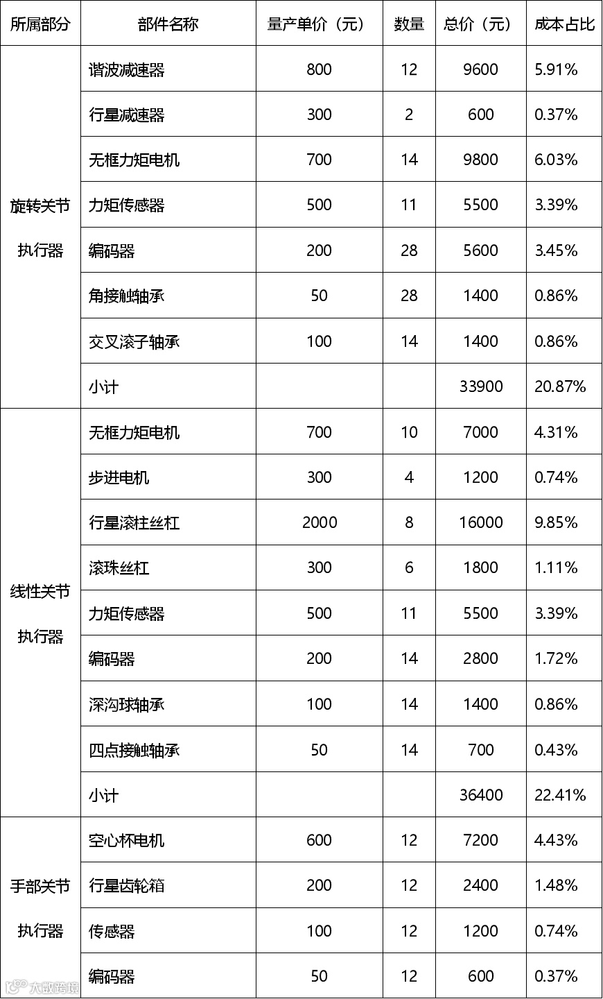表1-特斯拉Optimus Gen2的成本结构