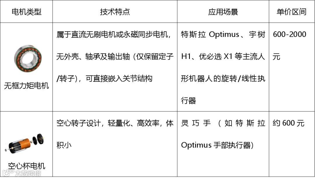 电机是执行器的核心动力源,人形机器人中主要使用无框力矩电机(关节驱动)和空心杯电机(灵巧手驱动),其中无框力矩电机为重中之重。