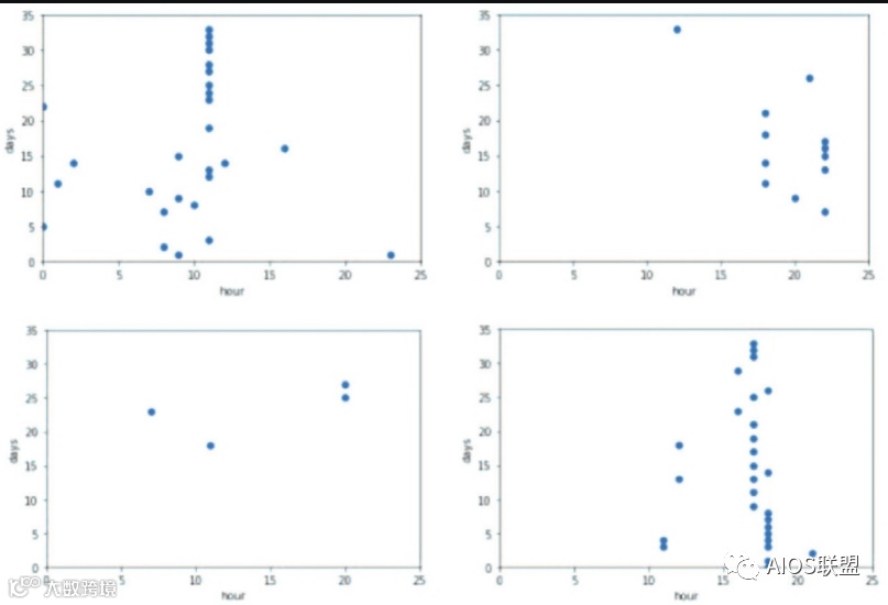 下图展示了4位住户的历史出行记录,对其历史数据进行可视化后,按天作为纵坐标单位,每一个小时区间作为横坐标,若该住户在第y天的第x小时区间有出行记录,则在(x,y)处画一个点进行标记。可以看出,不同住户的行为习惯同样存在较大差异。