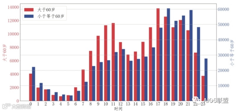 观察不同住户群体的不同出行习惯,将住户分为了两组,一组是年龄大于60岁的,一组是年龄小于60岁的,按小时统计他们每天出行的时间。