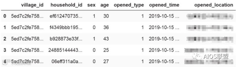 其中“village_id”和“household_id”分别表示社区ID和住户ID信息,“opened_time”表示出行时间,“opened_location”表示出行目的地。