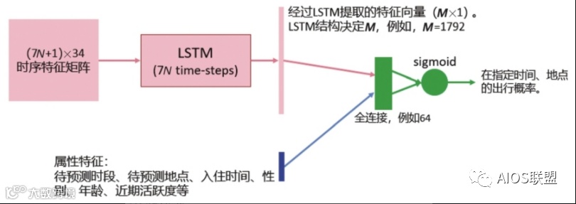 将序列数据输入递归网络中提取时序特征向量,本案例采用LSTM网络作为递归网络模块,然后将其与画像属性特征拼接,接入全连接层,完整的结构图如下图。