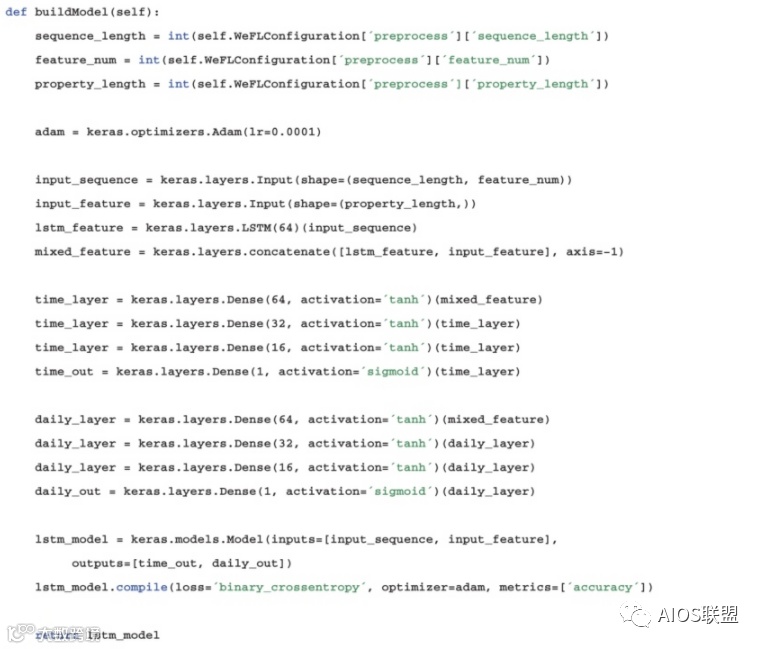 代码先读取配置文件,按照其设定,设置了时序特征的长度(即天数,sequence_length)、用户画像特征的长度(property_length)和每一天的输入特征长度(feature_num),并创建LSTM网络得到时序特征向量lstm_feature,将其与用户画像特征input_feature进行拼接后,得到混合向量mixed_feature,再接入全连接层,得到出行时间的预测概率。