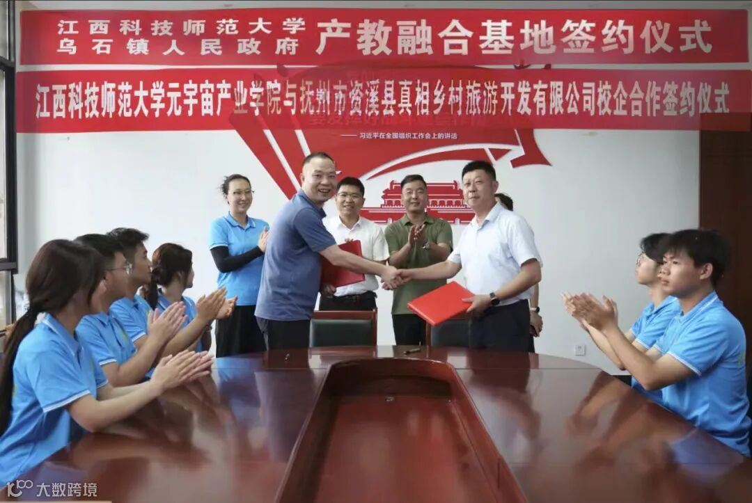 随后,学院分别与资溪县乌石镇真相乡村旅游开发公司签署《就业、实习基地合作协议书》,明确共建农产品电商直播实训基地、VR文旅项目开发等合作内容;与乌石镇人民政府签订《大学生社会实践与志愿服务基地合作协议书》,将依托“红数苗”品牌开展推普助力乡村振兴、非遗数字化保护等社会实践活动。