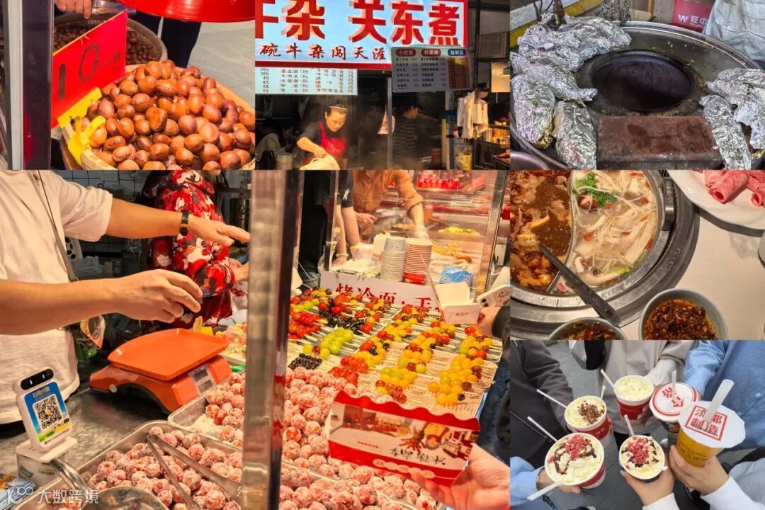 学院东门旁摊位林立,各色小吃琳琅满目,香气四溢,烤串的烟火在夜空中升腾,仿佛是夜市的呼吸,将人们的热情和期待点燃,烤冷面、煎饼、麻辣烫……每一种食物都承载着不同的文化和故事,等待着我们的探索。