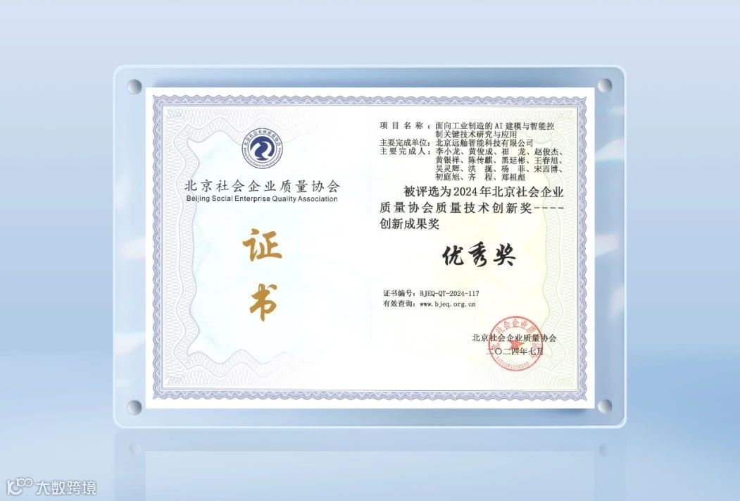 远舢智能作为IDC重点推荐的先进工业控制领域潜力供应商,提报的《面向工业制造的AI建模与智能控制关键技术研究与应用》成功通过北京社会企业质量协会专家学者全面评审考核,从众多高质量项目及优秀的创新模式中脱颖而出,荣获2024年质量技术创新成果优秀奖。