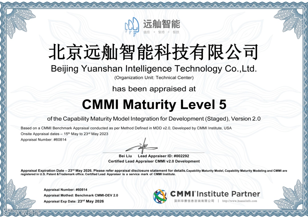 本次斩获CMMI5认证,是对远舢智能在研发能力、组织能力以及质量管控等各方面综合实力的认可,标志着远舢智能在软件研发水平和管理质量方面跻身全球软件业先进水平。