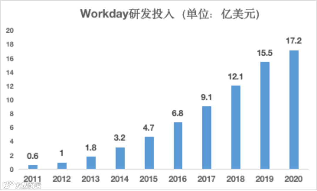 大中型目标客户的优势在于相对较高的客单价,而差异化、针对性的服务模式又增加了客户粘性。超过90%的客户留存率、85万美元的平均客单价为Workday提供了现金流保障,也为Workday持续的研发投入和后续大量的并购创造了条件。根据Workday的官方介绍,公司目前为全球8000多家公司提供HCM服务,客户满意度超过98%,客户留存率超过95%,同时拥有潜在的客户33000家,市场潜力巨大。