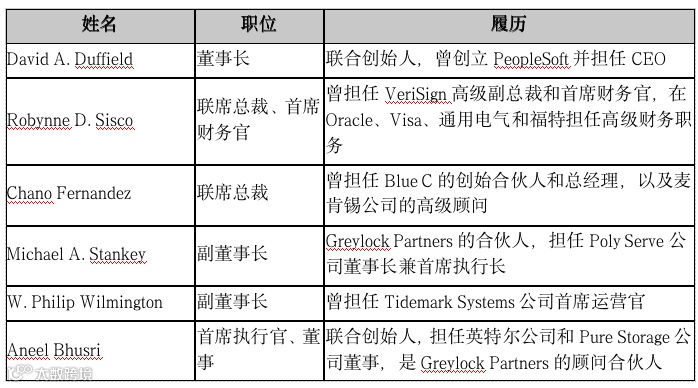Workday的创始团队具备丰富的人力资源相关领域经验,推出的产品、服务更加符合企业的需求。公司的创始人David Duffield与 Aneel Bhusri曾任职于人力资源管理系统提供商PeopleSoft。David于1987年创立了PeopleSoft,在十几年的发展中,相继开发人力资源管理、ERP、CRM等多种软件产品,沉淀了丰富的行业经验。2005年,该公司被Oracle收购,随后则有了Workday的诞生。公司领导层亦是群英荟萃,汇聚了来自Oracle等软件公司及Visa、麦肯锡等金融公司的人才,为其两大核心业务的发展打下了坚实的人才基础。