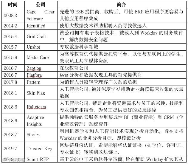 2008年2月Workday进行了第一次收购,通过收购先进的ESB提供商Cape Clear Software,帮助其ERP应用程序更便捷地与其他应用程序集成。自此之后,Workday相继在数据分析、人工智能、教育、业务规划等众多领域展开了大量的横向、纵向并购,被收购公司广泛分布于区块链、数据科学、在线教学、机器学习、人工智能等多个技术领域。公司通过积极的收购策略,不断深化产品、拓宽业务范围,增强了企业的云服务、业务规划和大数据分析能力,实现Workday的多业务扩展。