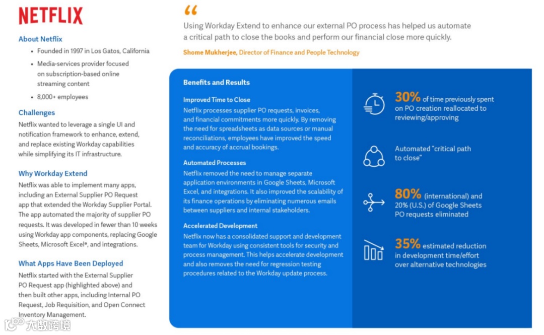 Netflix是Workday官方案例中的一个典型。Netflix是全球领先的互联网电视网络平台,在全球190多个国家/地区拥有超过1.1亿会员,每天观看超过1.25亿小时的电视节目和电影,内容包括原创剧集、纪录片和故事片等。作为世界领先的互联网电视网络平台,公司采用了多个不同的后台系统支撑企业运营,超过11个后台系统的手动协作让企业显得十分笨重。