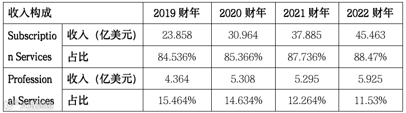 Workday的收入构成中,订阅服务收入为营业收入的主要来源,四年占比分别达到了84.54%、85.37%、87.74%和88.47%,营业收入保持高速增长主要得益于新签客户和老客户续签。