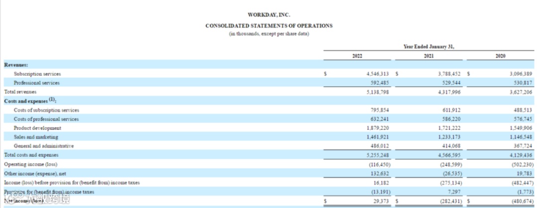 Workday的年报显示,截至1月31日的2019财年、2020财年、2021财年、2022财年Workday的营业收入分别为28.22亿美元、36.27亿美元、43.18亿美元、51.39亿美元;净利润为-4.18亿美元、-4.81亿美元和-2.82亿美元、0.29亿美元,2022财年实现了扭亏为盈(注:Workday 2022财年实现盈利转正,依靠的是其1.3亿美元的‘Other income (expense), net’,而公司的‘Operating income (loss)’依旧为负。根据Workday年报说明,与2021财年相比,2022财年的‘Other income (expense), net’增加,主要与公司股权投资确认的1.24亿美元净收益有关,其中8300万美元是由于一项股权投资在2022财年完成了IPO。此外,由于采用了2020-06号会计准则更新,以及在2021财年转换了1.50%的可转换优先票据,Workday的可转换优先票据的利息费用减少了5200万美元,由于现行利率较低,有价证券的利息收入减少了1300万美元,抵销了这一减少额)。