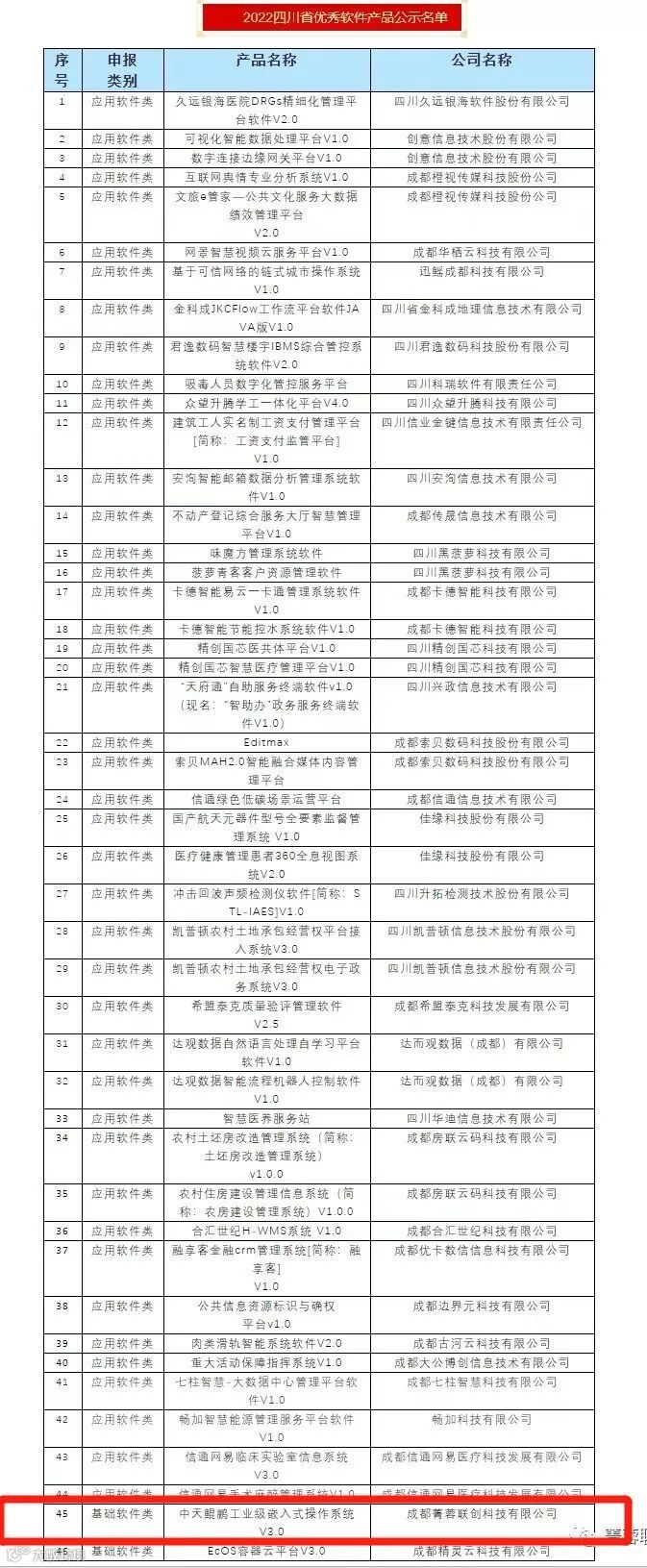 国际创投已投资企业成都菁蓉联创科技有限公司(简称菁蓉联创)三喜连珠,满贯折桂!菁蓉联创荣获2022年四川省软件行业具有核心竞争力软件企业,总经理张昆先生荣获2022年四川省软件行业优秀企业家,主打产品基础软件类中天鲲鹏工业级嵌入式操作系统V3.0荣获2022四川省优秀软件产品。