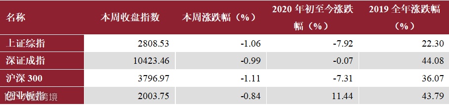 本周上证综指收跌1.06%报2808点,深证成指收跌0.99%报10423点,沪深300收跌1.11%报3796点,创业板指收跌0.84%报2003点。