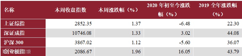 本周上证综指收涨1.37%报2852点,深证成指收涨1.33%报10746点,沪深300收涨1.12%报3867点,创业板指收涨1.96%报2086点。