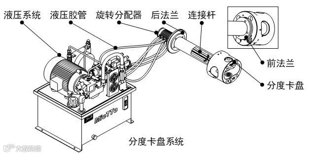 从分度卡盘加工的整个过程来看,如图包括了液压站、分油器、法兰、连接杆组件、选配的卡死报警器等部件: