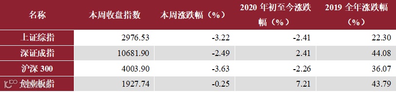 本周上证综指收跌3.22%报2976点,深证成指收跌2.49%报10681点,沪深300收跌3.63%报4003点,创业板指收跌0.25%报1927点。