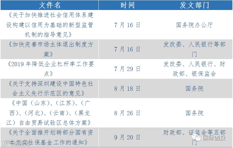 观点:本季各部委相关发文中,最引人注目的当属发改委联合四部委发布的《加快完善市场主体退出制度方案》,方案明确了建立全面覆盖各类市场主体退出制度体系的目标,提出了优化退出方式、完善退出程序、提高退出效率的一系列措施,进一步完善我国破产制度的具体举措,以及分步推进建立自然人破产制度等重大改革任务,将使我国破产制度更加适应经济发展和社会进步的需要,推动社会主义市场经济体制的完善,激发市场主体的竞争活力,为市场机制在资源配置中发挥决定性作用奠定更坚实的基础。