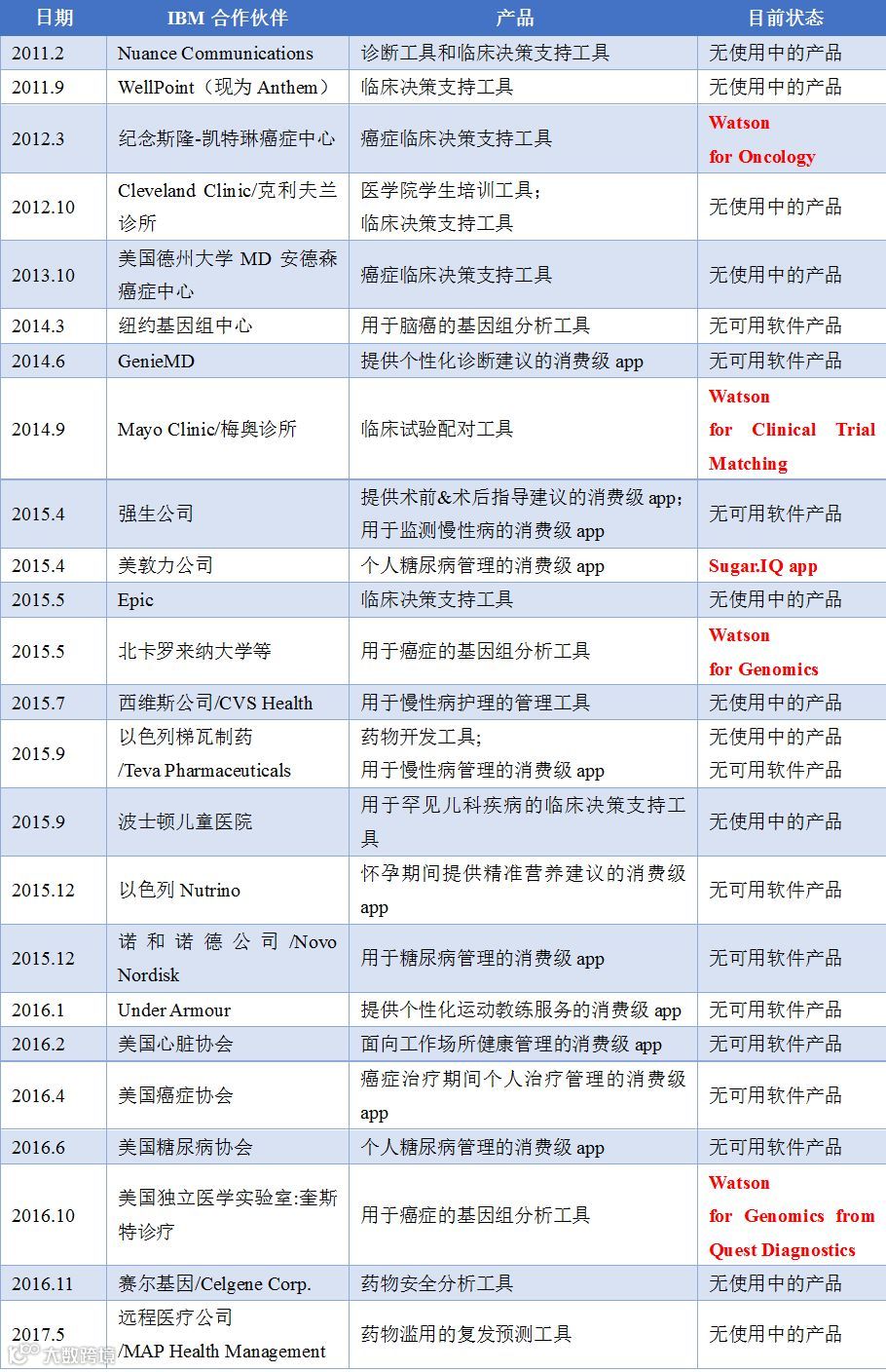 IBM自2011年正式踏入AI医疗领域后,产品具体如下:
