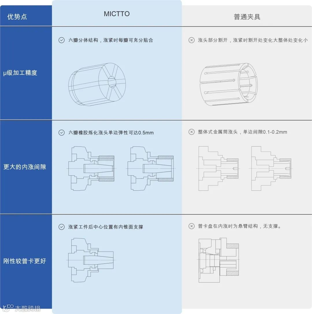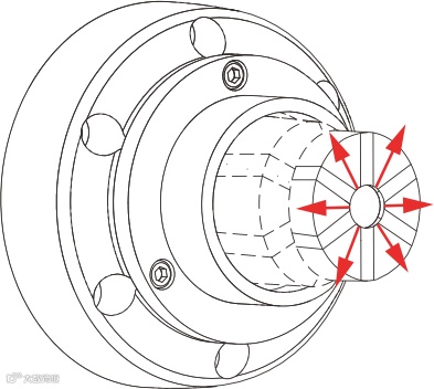 橡胶内涨卡盘实现产品全包式涨紧,有更好的涨紧刚性,更高的涨紧精度。橡胶内涨卡盘的橡胶涨芯相比金属式涨芯有更大的弹性空间,产品装夹空间更大。