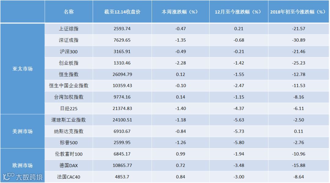 截至本周五美国道琼斯工业指数和标普500指数已回吐全年涨幅,全年分别累跌2.5%和2.76%。Facebook从52周高位下跌34.1%,苹果下跌28.87%,亚马逊、谷歌同样下跌超15%,目前仅微软一家公司维持超过8,000万美元的市值。国际贸易局势和缓激起的乐观情绪正在消退,受特朗普威胁民主党派“若不支持移民改革,就关闭联邦政府”的言论影响,以及英国内阁就脱欧、二次公投等阵营分裂导致的政治不确定性,市场重燃担忧情绪。叠加欧洲和中国疲弱的经济数据,全球熊市情绪逐渐升温。