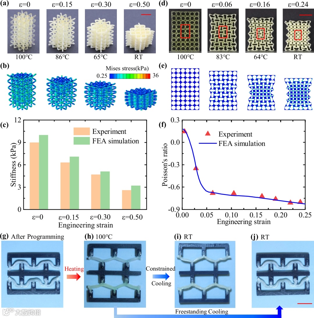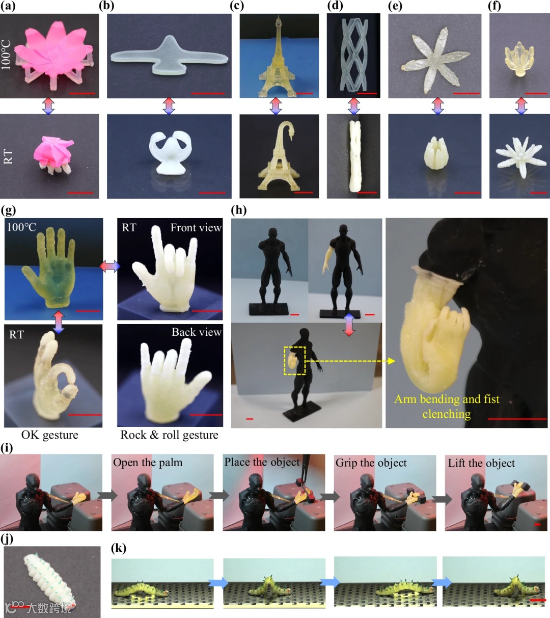 功能应用拓展: 成功将该材料应用于制造具有温度响应功能的活性机械超材料(如刚度可调晶格、可变泊松比结构)、可重复变形结构(如可展开天线、变形机翼、仿生花朵)以及软体机器人(如可做手势的手、可抓握物体的假肢、可爬行的尺蠖机器人)。