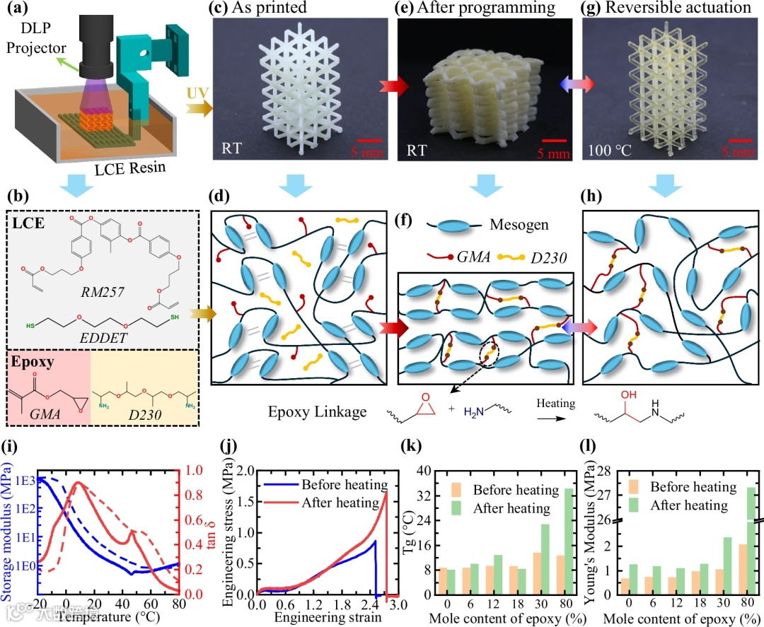 新型双阶段可紫外光固化液晶弹性体材料: 研发了一种包含两种可反应基团的液晶弹性体材料体系。首先,通过紫外光固化丙烯酸酯基团,形成初步的网络结构,将材料打印成所需形状。此时,材料中的环氧基团保持未反应状态。