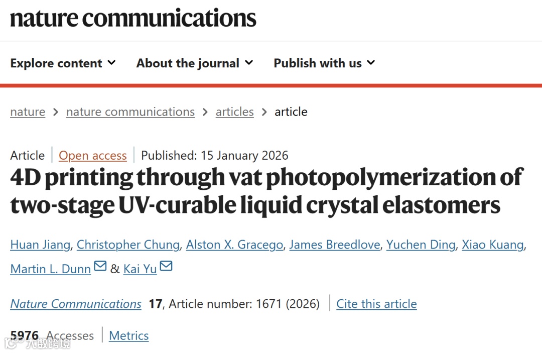 文章信息:Jiang, H., Chung, C., Gracego, A.X. et al. 4D printing through vat photopolymerization of two-stage UV-curable liquid crystal elastomers. Nat Commun 17, 1671 (2026).