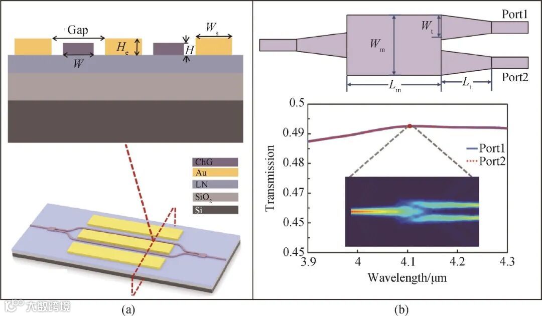 图3 MIR薄膜铌酸锂调制器的整体结构及MMI结构示意图。(a)MIR电光调制器的整体结构,插图:调制区截面图;(b)MMI结构示意图,插图:在4.1 μm处模拟的双端口透过率及电场分布图