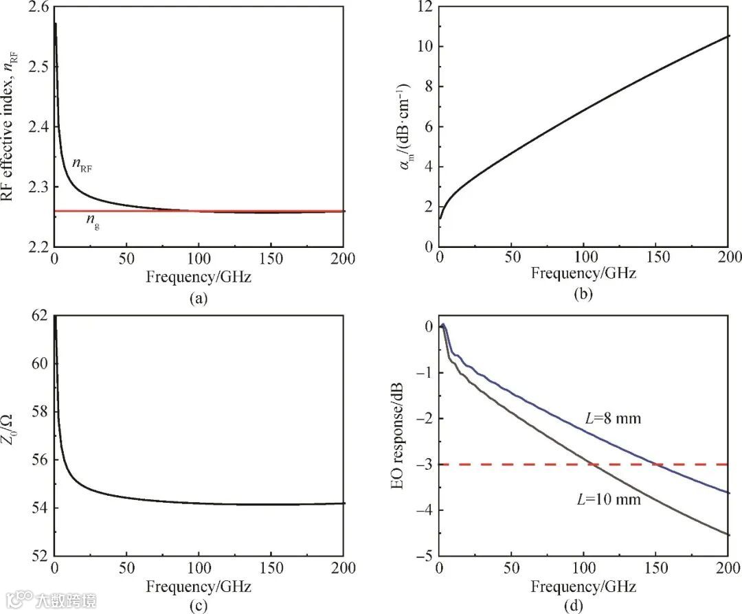 图4 MIR电光调制器的频率响应。不同频率下的微波折射率(a)、微波损耗(b)、特征阻抗(c)及电光响应(d)仿真分析
