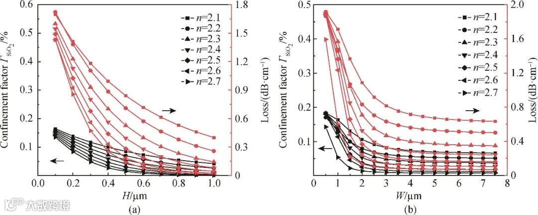 图1 不同折射率下ChG波导结构中SiO2层的光场限制因子与吸收损耗特性。(a)随ChG厚度变化的关系;(b)随ChG波导宽度变化的关系