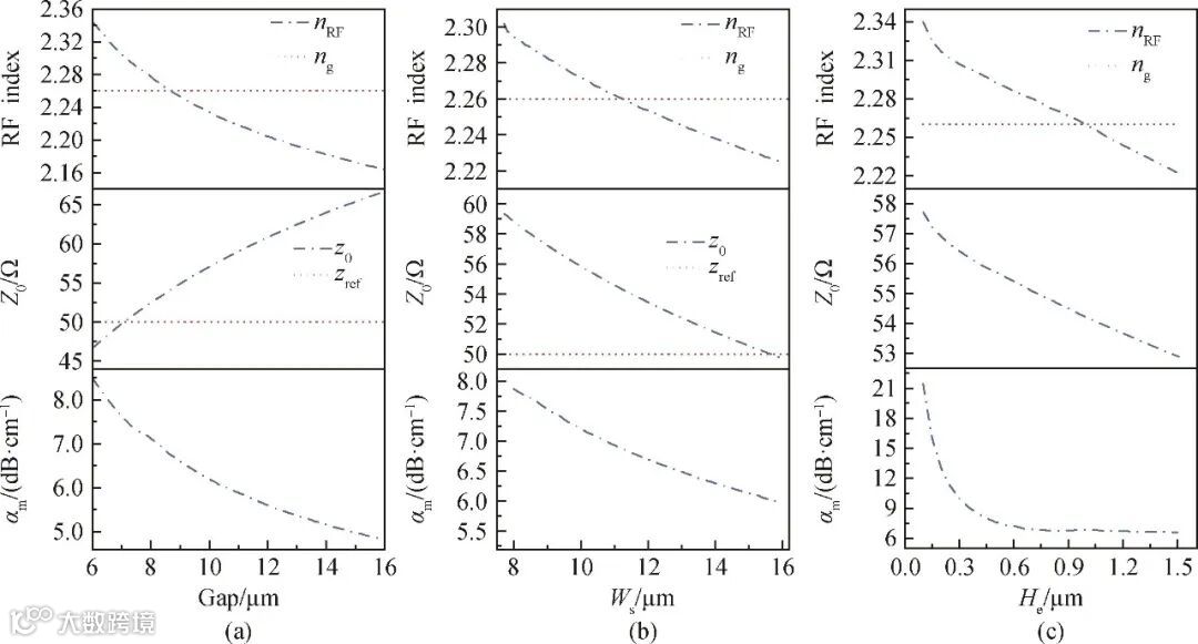 图2 电极结构参数对射频特性的影响。不同电极间距(a)、电极宽度(b)和电极厚度(c)下微波折射率、特征阻抗及微波损耗的仿真分析