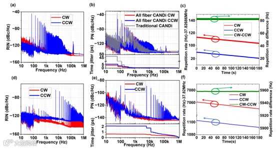 图 3:全光纤CANDi 激光器的噪声性能。(a)-(c)单波长双向锁模状态下的相对强度噪声(RIN)、相位噪声(PN)和重复频率的稳定性。(d)-(f)双波长双向锁模状态下的RIN、PN和重复频率的稳定性。