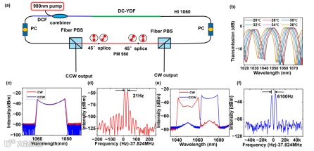 图1:(a)全光纤CANDi 激光器的实验装置图。(b) Lyot 滤波器的透射光谱。(c)和(d)单波长双向锁模状态下的光谱和射频谱。(e)和(f)双波长双向锁模状态下的光谱和射频谱。