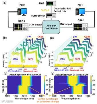 图 2:全光纤 CANDi 激光器自启动能力的验证。(a)自启动验证装置。(b)和(c)在泵浦功率周期性调制下,激光器两个方向输出光谱的实时演化。(d)和(e)通过改变滤波器波长从双波长状态切换到单波长状态的模拟结果。