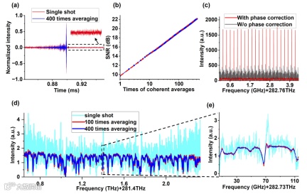 图4:使用全光纤 CANDi 激光器对高Q值微腔的表征。(a)单次测量与相干平均后的时间域干涉图 。(b)信噪比随相干平均次数的变化情况。红色虚线表示线性趋势。(c)带有和不带有相位校正的梳齿分辨双梳光谱。(d)具有不同平均次数且去除包络后的透射光谱。(e) (d)的局部放大图,展示了微谐振腔的一个谐振峰。